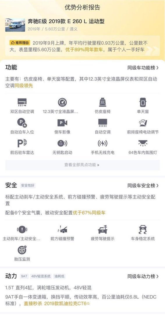 总结来看,2019款奔驰E260L不仅在动力性能、配置以及安全性方面表现出色,还凭借其豪华的品牌价值与相对合理的二手车价格,成为了许多消费者心目中的理想选择。无论是商务出行还是日常驾驶,它都能为车主带来无与伦比的驾驶体验和舒适感。如果您正在寻找一款高性价比的豪华轿车,2019款奔驰E260L无疑是一个非常值得考虑的选项。
