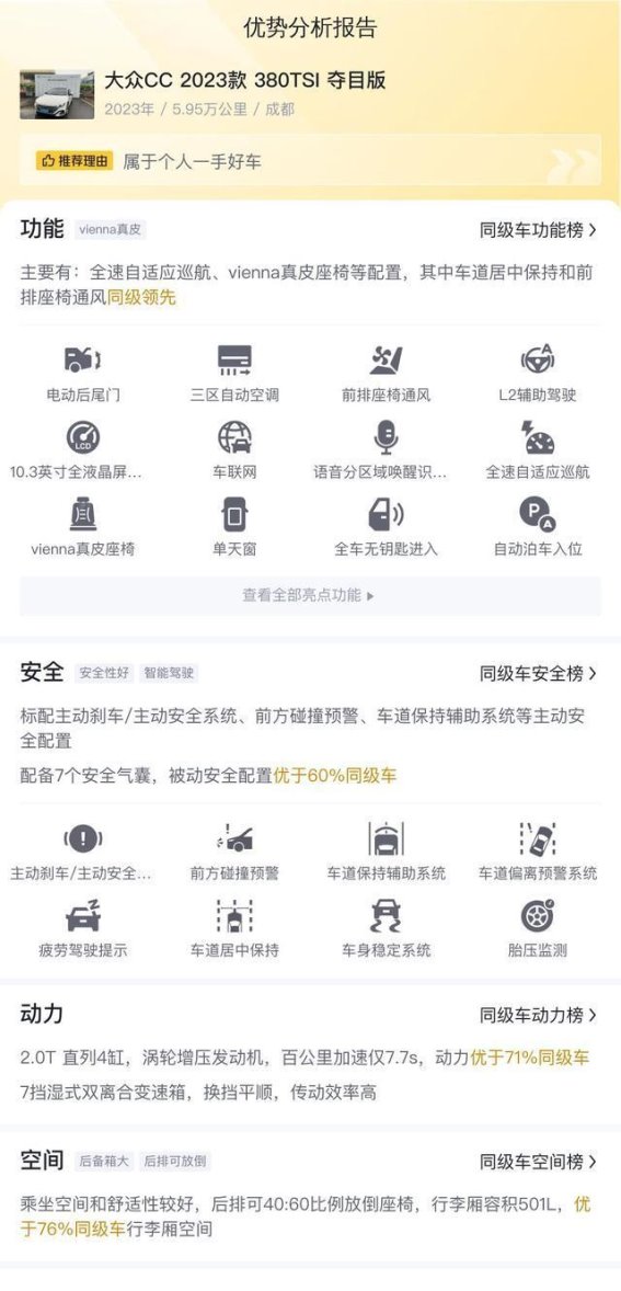 2023款大众CC 380TSI 夺目版凭借其低里程、高性价比和丰富配置,成为二手车市场中一款非常值得推荐的车型。无论是动力性能、驾乘舒适性,还是智能科技配置,这款车都能提供出色的表现。如果你正在寻找一款兼具运动性与舒适性的中型轿车,这款大众CC无疑是一个值得关注的选项。13.98万元的售价,在同类二手车中具备明显的价格优势,性价比极高,对于预算有限但又不愿妥协于品质的消费者来说,这款车无疑是个理想的选择。