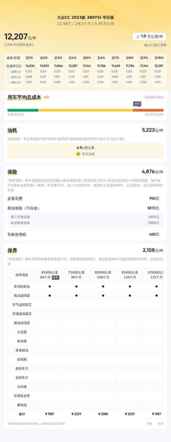 在购车时,除了考虑车价外,用车成本的预测也极为重要。根据懂车帝的分析,大众CC 2023款 380TSI 夺目版的10年平均用车成本为12473元/年,相较于同级别的车型,这一费用是适中的。考虑到该车的油耗表现较为经济,且保养成本不高,整体的用车费用也不会对车主造成过大的负担。