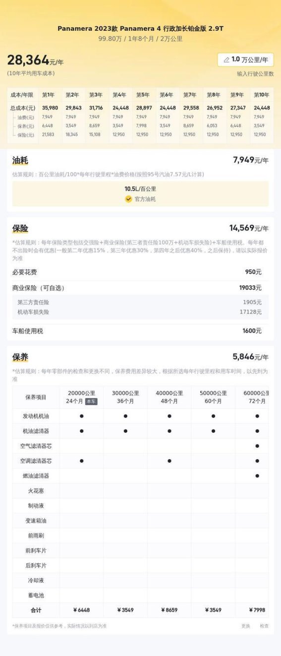 从用车成本来看,保时捷Panamera的10年平均用车成本为28288元/年,相较于同级别的豪华车型,其用车成本处于适中的水平。在保养、保险和燃油等方面的支出都较为合理,能够有效降低长期用车的经济负担。这对于那些追求高端体验的消费者来说,是一个值得考虑的重要因素。