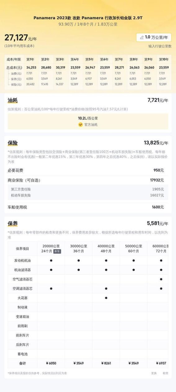 购买豪车的消费者,通常会对用车成本非常关注。根据数据分析,这款保时捷Panamera 2.9T的十年平均用车成本大约为27,181元/年。这个数字对于一款豪华车来说,已经算是较为合理。虽然保时捷作为高端品牌,其日常保养和维修费用会相对较高,但考虑到它的性能与舒适性,这个费用是值得车主接受的。