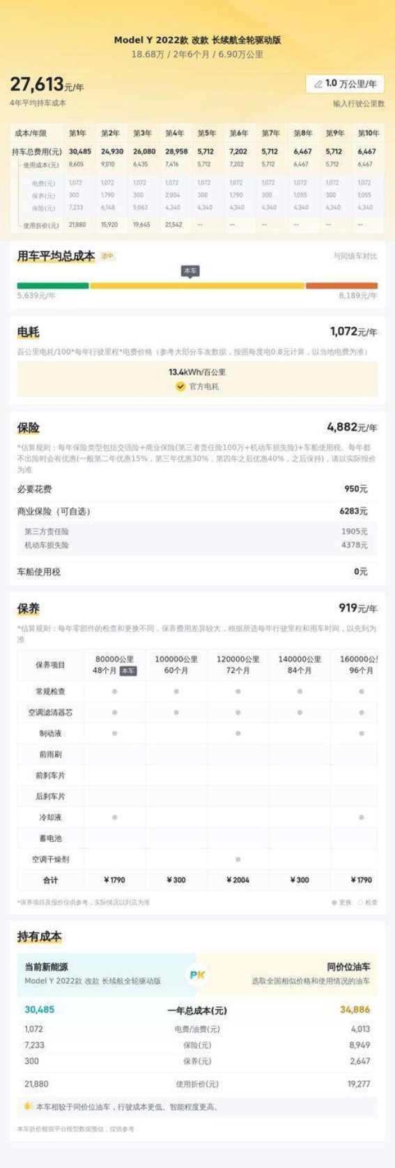 从用车成本来看,电动汽车的优势在于长期使用成本较低。Model Y的官方续航为660公里,百公里加速时间仅为5秒。对于日常通勤或偶尔的长途驾驶来说,这一续航里程完全能够满足需求。根据懂车帝的大数据分析,这款车的年均用车成本约为2.8万元,主要包括电费、保险和常规保养费用。相比传统燃油车,电动车的用车成本显然更具吸引力,尤其是在油价不断上涨的背景下,电动SUV的优势更加明显。
