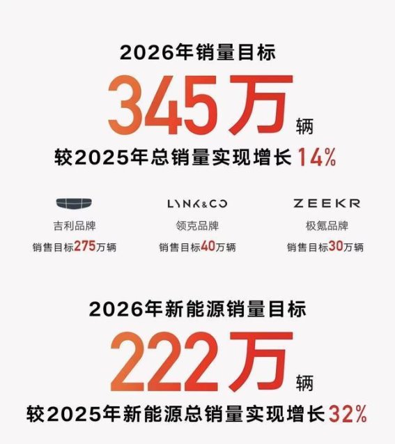 吉利汽车2025年超额完成了300万辆的销量目标,实际销量达到302万辆,体现出其在市场上的强劲表现。展望2026年,吉利的目标更为宏大,计划实现345万辆的销量,同比增长14%。这一目标的设定意味着吉利将加大在国内外市场的布局,尤其是在新能源领域的扩展。