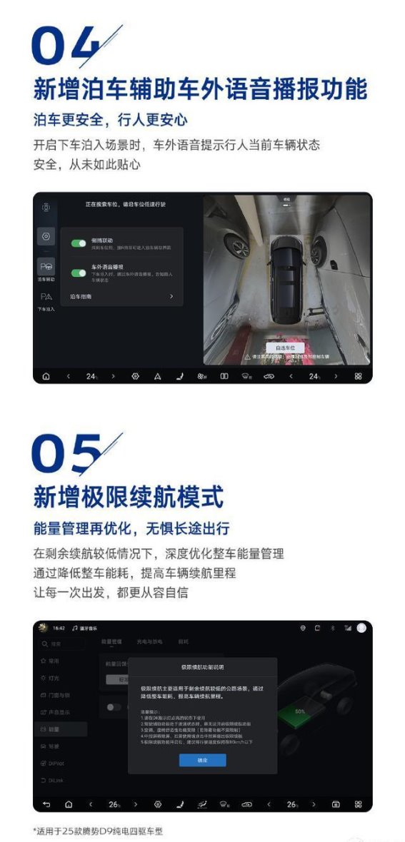 除了上述功能,腾势D9此次OTA升级还进行了多个细节优化,包括新增“能源口盖未关”播报、待机状态改进等,这些都让车主在使用过程中更加便利。随着智能技术的不断发展,腾势D9的每一次升级都在不断完善和提升其综合竞争力,满足了车主对驾驶安全性、智能化和舒适性的多重需求。