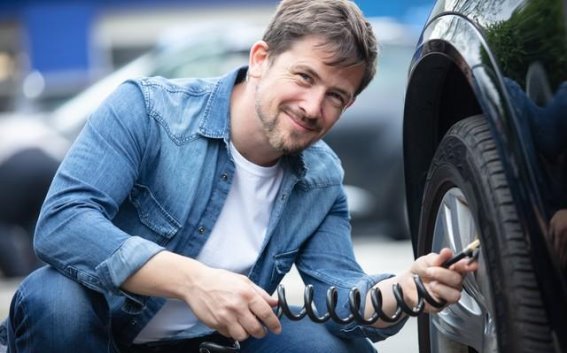 车载充气泵和补胎液是不可缺少的装备。很多新能源车出厂时已经配备了这些工具,它们能在关键时刻帮助你脱困。如果轮胎被小钉子扎了,完全不需要换备胎。你只需先把钉子拔出来,接着把补胎液的接口拧在气门嘴上,按照说明操作,补胎液就会自动填充破损处,然后用充气泵补充胎压,恢复到正常值后,便可行驶,等到找一个维修店处理就行了。