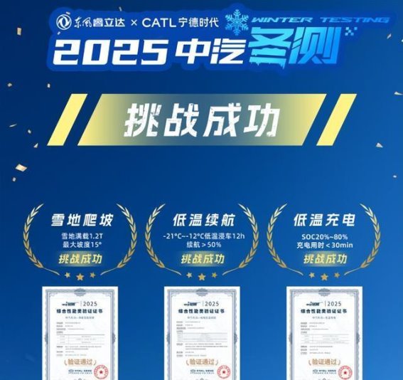 第三方权威机构中汽信科的验证方案,将真实城际物流环境搬到场景中,确保了数据的公信力与可参考性。在此次验证中,东风睿立达在电池温控、低温快充和雪地爬坡等多项核心指标上均处于行业领先水平。电池水温控制精度达到±2℃,低温快充从20%至80%仅需24.1分钟,满载15°雪坡动力稳定可靠,满足寒区商用车运营的高标准要求。车辆还针对低温加速性能、油门响应灵敏度等17项关键参数进行专项标定,智能热管理系统与宁德时代电池协同优化,实现低温条件下的高效能量管理,为行业提供可复制的技术路径。这一系列严苛不仅为电动商用车冬季应用提供了扎实的实证,也为整个行业的技术升级树立了参考标杆。