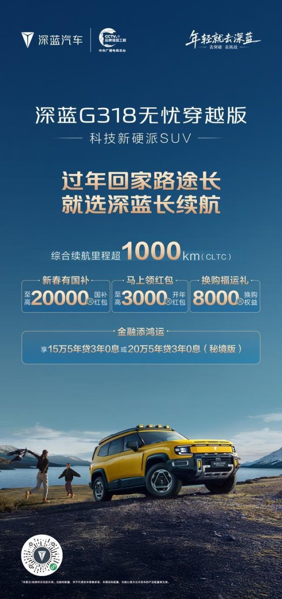 深蓝G318无忧穿越版凭借其卓越的续航能力、强大的智能科技和一系列购车福利,已经成为春节长途旅行中的不二之选。它以高效、舒适、安全的表现,满足了现代消费者对出行的全部需求。选择深蓝G318无忧穿越版,告别繁琐的充电和行车焦虑,让回家的路途更加畅快无忧。