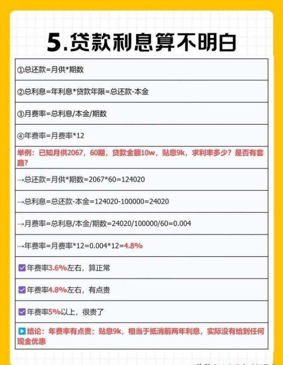 贷款购车前,一定要计算清楚贷款的真实成本。贷款总利息等于总还款额减去贷款本金,年利率则需要通过总利息除以贷款本金,再除以贷款年限来得出。如果年利率超过5%,则要特别注意,避免陷入高利贷的陷阱。