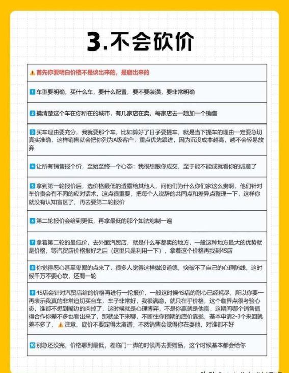 多跑几家4S店,甚至通过不同的销售员进行询价,并要求他们相互竞争。在拿到一个报价后,可以直接问:“还能再低一点吗?”通过这样反复询价,销售员一般会降低一些价格,让你获得更大的优惠。