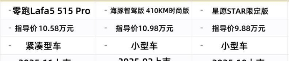整体来看,三款车型虽售价相近,但定位差异明显。海豚和星愿延续小型代步车的实用风格,车身灵活,适合城市通勤、日常代步。零跑Lafa5则在动力、续航、空间、智能化和驾控质感上更全面,打破了以往10万元左右车型的局限,对于家庭出行、长途驾驶和智能化体验有更高需求的用户来说,是更值得考虑的选择。对于追求全能型家用新能源车、关注驾控和科技感的年轻家庭,零跑Lafa5 515 Pro版本无疑是最佳选项,同时还享有购置税优惠、终身质保和家充服务等多重权益,让日常用车更轻松、便利。