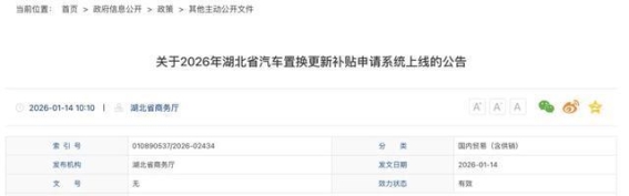 导读:2026年,湖北省汽车以旧换新政策正式启动,省商务厅于1月14日发布了《关于2026年湖北省汽车置换更新补贴申请系统上线的公告》,明确了本年度汽车置换更新补贴申