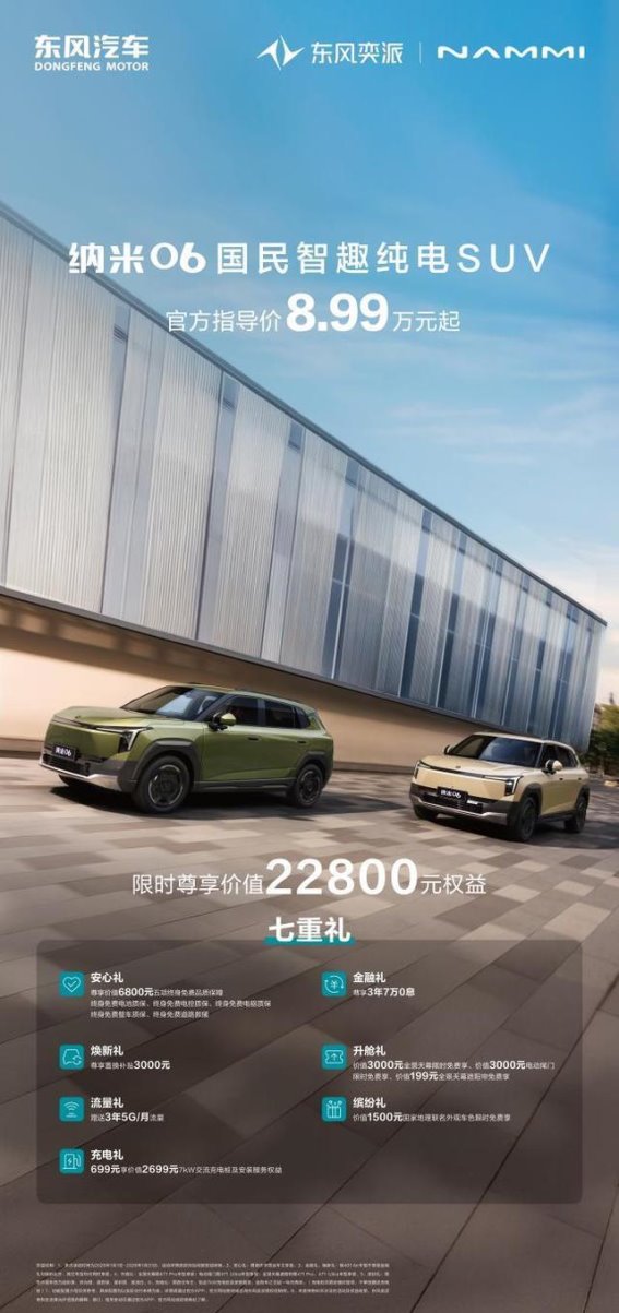 除了eπ008和eπ007+,东风奕派旗下的纳米系列也在2026年保持着市场热度。作为一款极具潮流气质的车型,纳米01自上市以来便以其独特的设计和精致的做工,成为了不少年轻人心中的“时尚单品”。为了进一步提升其市场竞争力,2026年,纳米01的价格被调整至5.88万元起,并且推出了三重购车福利,帮助消费者享受到更多的政策红利。纳米06作为一款备受瞩目的智能SUV,在2025年已成功进入国际市场,并获得了多项国际大奖。2026年,纳米06推出了至高22800元的购车福利,官方指导价从8.99万元起,进一步提升了消费者的购车价值。