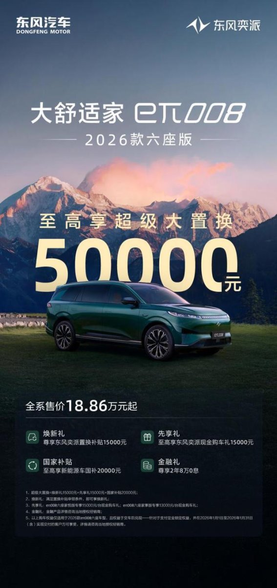 作为奕派科技的主力车型之一,eπ008一直以“大舒适家”定位,赢得了大量家庭用户的青睐。这款车不仅拥有卓越的安全性能,还凭借其超越同级的舒适性和宽敞的空间,成为了15-20万级新能源中大型SUV的销量榜单常客。2026年,eπ008依旧保持着强劲的市场竞争力,特别是在购车福利方面,推出了至高可享50000元的置换优惠,同时也推出了多重好礼,减轻了家庭购车的经济压力。eπ008五座版和六座版的焕新价格也更具诱惑力,从15.99万元起,不仅让更多家庭能够拥有新能源车型,也让消费者更加放心地享受高品质的出行体验。