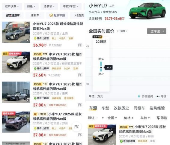 更为复杂的是,部分热门车型如小米YU7也在二手市场中出现溢价现象。由于这款车型的交付周期较长,二手车商家在二手市场上通过溢价出售,价格远高于新车售价。根据懂车帝平台的数据,现有的小米YU7二手车挂牌价比官网售价贵了数万元,这种现象也引发了消费者的关注和不满。