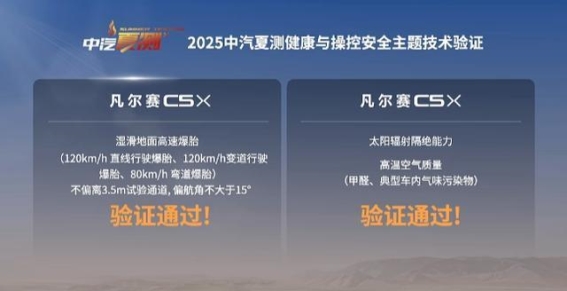 7月21日,凡尔赛C5X参与了由中汽中心主办的夏季高温,涵盖了车内空气质量、太阳辐射隔离能力以及爆胎情况下的车身稳定性。通过此次,凡尔赛C5X不仅成功通过了相关验证,还获得了中汽中心的认证,充分证明了其在高温条件下的出色表现。