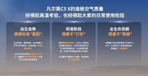 在空气质量方面,凡尔赛C5X同样表现出色。作为一款符合全球环保法规的车型,凡尔赛C5X从选材到生产过程都严格把控,采用了可回收的TPO真空级塑表皮、水性胶和热熔胶等环保材料,并通过了多项气味和VOC抽检,确保车主和乘客在车内呼吸到的是清新、健康的空气。