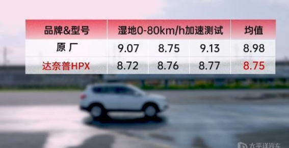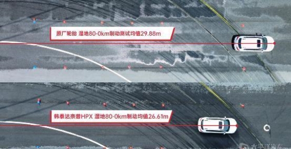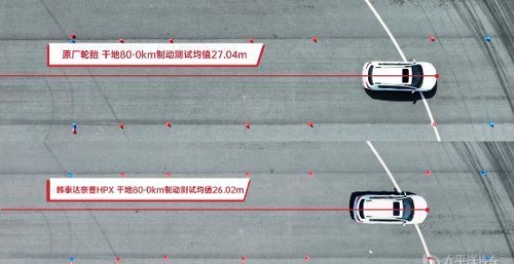 在制动性能中,达奈普HPX轮胎的表现同样令人满意。在80km/h的急刹车中,达奈普HPX的最短制动距离为26米,而原厂轮胎为27米,尽管差距不大,但在紧急制动时,每一米的差距都可能决定安全的边界。无论是加速还是制动,达奈普HPX轮胎的提升都为驾驶者提供了更为可靠的保障。