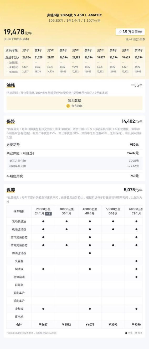 从市场行情来看,目前这款奔驰S 450 L 4MATIC的二手车报价大约为105.8万元。与全新车相比,价格差距达到40.58万元,这使得它在二手车市场中具备了极高的性价比。虽然这款车的用车成本并不低,但以其卓越的性能和豪华的配置来说,这样的价格无疑是一种值得投资的选择。根据过去10年的用车成本来看,奔驰S 450 L 4MATIC的年均用车成本为21779元,处于同级车的正常水平,远低于一些同级豪华车的最高用车成本。