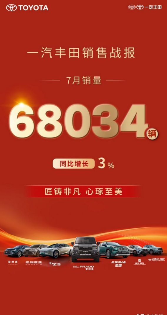 导读: 2025年7月,一汽丰田交出了令人瞩目的成绩单。7月份新车销量达到68034辆,同比增长3%,继上半年16%的强劲增长之后,