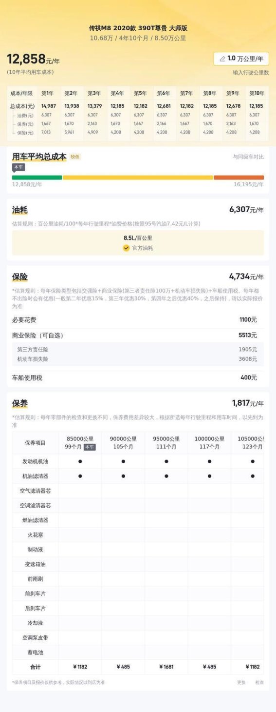 关于用车成本方面,根据懂车帝统计数据显示,这辆传祺M8的平均用车费用约为每年1.34万元,处于合理区间。相比同级别的其他MPV车型,它的维护保养成本中等偏低,既不会给车主带来过大负担,也能保障车辆的正常运转和持久耐用。具体费用还会根据实际驾驶习惯、保养频率以及道路状况有所浮动,但整体来看,传祺M8的用车经济性表现良好,适合既关注车辆品质又关注后续开支的消费者。
