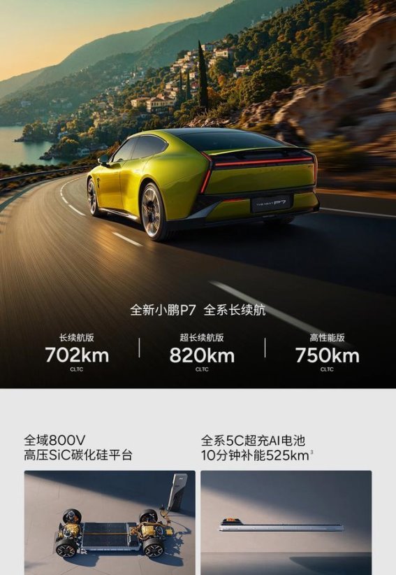 在核心技术上,全新P7采用全域800V高压SiC平台,并搭载5C超充AI电池,补能速度成为其重要卖点。官方数据显示,车辆可在10分钟内补能525公里,电量从10%充至80%仅需11.3分钟,这样的表现不仅减少了长途出行的等待时间,也提升了车辆在紧急出行中的实用性。动力部分,全新P7采用中置电驱布局,零百加速仅需3.7秒,最高时速可达230公里/小时。底盘配置上,前悬架为全铝双叉臂,后悬架为五连杆结构,这种搭配在驾驶稳定性和舒适性上取得了良好平衡,令整车在高速和弯道中都能保持沉稳。