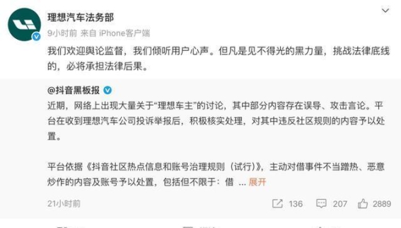 导读:8月12日晚,抖音黑板报官方微博发布声明称,近期网络上关于“理想车主”的讨论频繁出现,其中不乏误导性和攻击言论。平台在接到理想汽车公司的投诉后,迅速进行了核实和