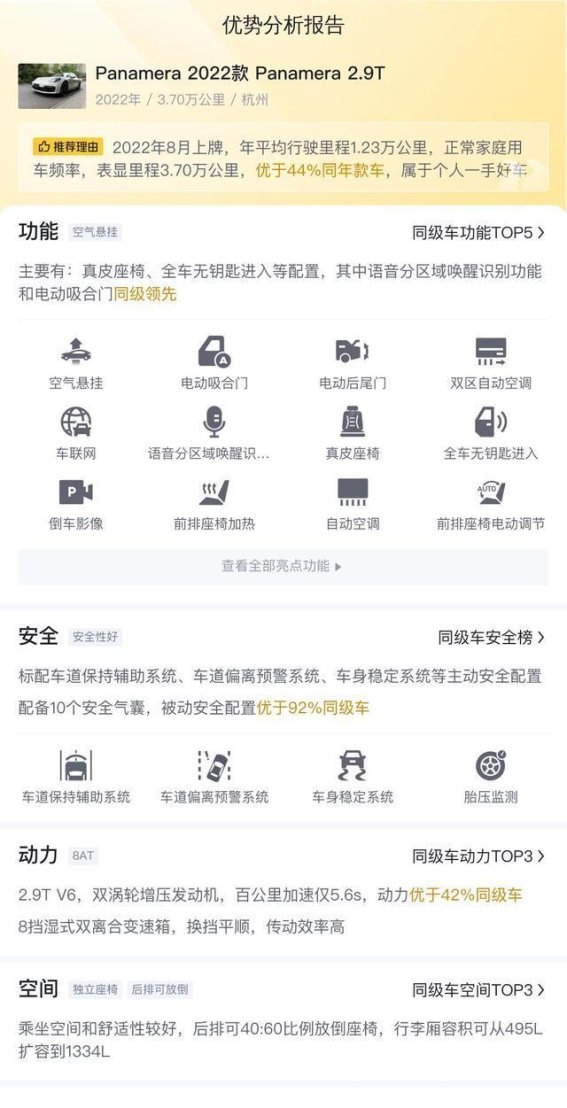 总体来说,这辆Panamera以强劲动力、豪华内饰、丰富配置和高保值率,为消费者提供了速度与舒适兼备的驾驶体验。无论是日常使用、商务出行还是偶尔的长途旅行,都能带来令人满意的驾乘感受。通过全面透明的检测和市场分析,购车者可以更清楚地了解车辆价值,实现理性消费与驾驶乐趣的平衡。