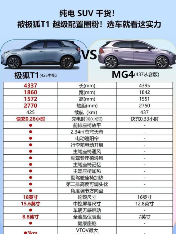 对于续航表现,极狐T1搭载了极光电池,采用PPB级安全标准,缺陷率低至十亿分之一,大大提升了电池的可靠性与安全性。其425km续航版本支持16分钟快充(30%-80%),即使在-20℃的低温环境下,电池依然能够保持83%的电量,这对于寒冷地区的消费者来说,无疑是一个极大的优势。虽然MG4的续航里程稍有优势,但在电池安全、充电效率和低温适应性方面,极狐T1的表现要更加出色。T1还全系标配3.3kW外放电功能,这使得用户可以在户外轻松为电器供电,满足野外露营、户外活动等场景的需求,进一步提升了车辆的使用便利性。