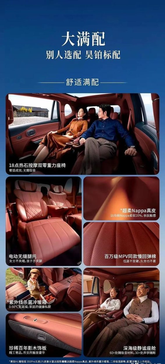 昊铂HL增程版在乘坐舒适性方面做足了功夫。车内配备了50瓦手机无线充电、前排及第二排座椅的通风/加热/按摩等配置,确保车主和乘客在长途旅行中的舒适体验。部分车型还配备了Nappa真皮座椅、后排17.3英寸液晶吸顶屏等高端配置,进一步提升了豪华感。二排座椅支持最大倾斜142度,零重力座椅设计提供12种按摩模式和三种按摩力度,车主可以根据个人需求调节座椅,以达到最佳的舒适体验。