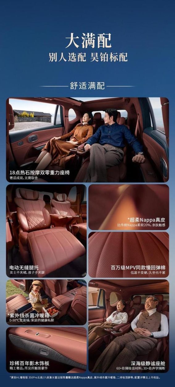 在座椅配置方面,二排座椅的豪华配置也值得一提。第二排提供双扶手设计和独立调节功能,具备加热、通风、按摩等多种舒适性功能,极大提升了长途出行时的舒适感。车内还配备了紫外线杀菌冷暖冰箱,能在不同温度条件下储存食品和饮品,为车主提供更多便利。