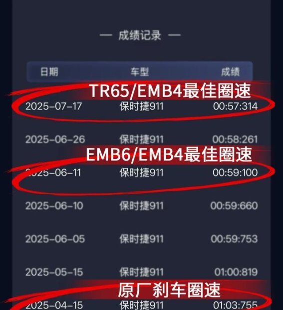 项目原厂刹车EMB6/EMB4TR65/EMB4圈速成绩01:03:75500:59:10000:57:314使用环境街道偏赛道兼容街道+赛道全赛道竞技级刹车性能基础线性抗热性强,反馈清晰极致咬合,稳定高温响应驾驶体验脚感模糊脚感线性提升刹车点极限后移,信心爆棚