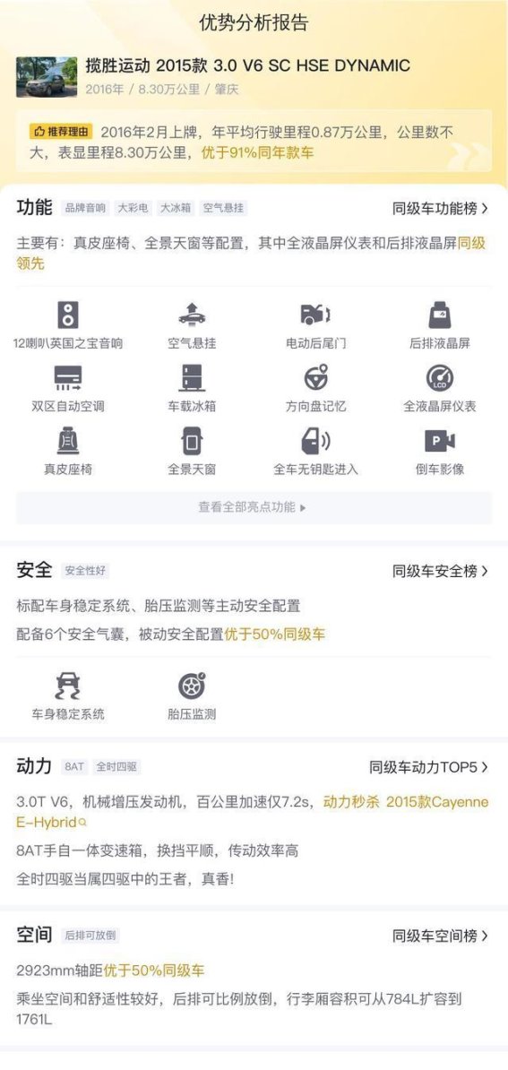 2015款路虎揽胜运动版3.0 V6 SC HSE DYNAMIC在各方面都表现出了豪华SUV应有的高水准。其动力系统强劲,驾驶性能卓越;配置方面丰富的安全与便利技术,让驾驶更加智能化;宽敞舒适的车内空间,适合各种驾驶需求。作为一款豪华车型,其保养成本较高,油耗也相对较大。购买时,消费者需充分了解车辆的实际状况,尤其是保养记录、过户次数等,确保购入的是一辆性能与外观都完好的车辆。