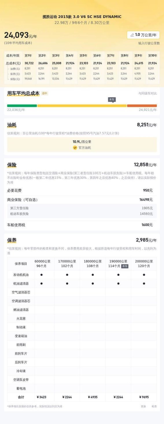 根据估算,2015款揽胜运动版的年均综合使用成本大约为2.4万元,这其中包含了燃油、保养、维修及保险等费用。虽然与普通车型相比,其养车成本较高,但作为一款豪华SUV,其成本还是在可接受范围内。实际的养车费用会根据使用频率、油价波动及保养状况有所变化,因此在购买时,潜在买家需要全面考虑长期使用成本,以避免未来的经济压力。