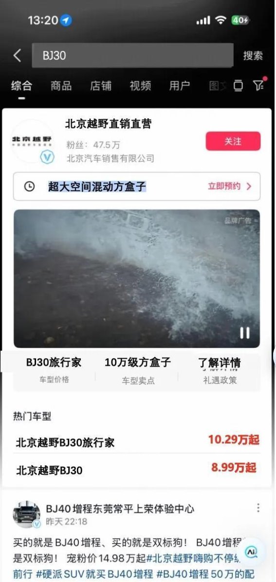 在“推-搜”环节,北京越野通过常态化精细化运营实现精准触达。一方面,联合达人开展分层创作,从产品解读到政策科普全面满足用户需求,同时借助AI工具将意向用户沉淀至私域,实现A3人群获取成本下降近40%。另一方面,通过搜索品专进行长线占位,确保用户在主动搜索“越野车型”“BJ40”等关键词时能够第一时间触达官方信息,将被动种草转化为主动问询,加速上市期的销量转化。这种策略不仅扩大了品牌影响力,还有效促进了用户主动触达和购买意向的形成,为直播及后续转化环节提供了坚实支撑。