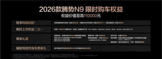 2026款腾势N9还通过OTA升级,逐步推送隐私声盾、一键无痕及全新辅助驾驶功能,2025款用户同样可享受升级后的科技豪华体验。车辆集合安全、性能、豪华与智能于一体,依托易三方平台的极致安全、云辇-A智能底盘系统及强劲动力,重新定义大型旗舰SUV标准。从手工打磨的双色车身到寓意深远的内饰设计,从权威认证的底盘到定眩智能防晕车系统,每一处细节都彰显对用户体验的极致追求。