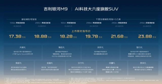 吉利银河M9在9月17日正式上市,起售价17.38万元,直接把性价比写在了脸上。如今“9”系车型一个接一个上市,但价格普遍偏高,例如乐道L90的起售价已经达到17.98万元,而银河M9以更低的价格亮相,显然是瞄准了想买大六座SUV的家庭用户。作为一款大六座SUV,银河M9不仅在价格上有优势,更在配置和续航上毫不妥协。六个配置版本覆盖17.38万元到23.88万元区间,纯电续航达到210公里,综合油耗仅为5.5L。这一系列数据看下来,银河M9无论是日常通勤还是家庭出行,都能满足大部分消费者的需求,同时也体现了吉利冲击销量爆款的野心。