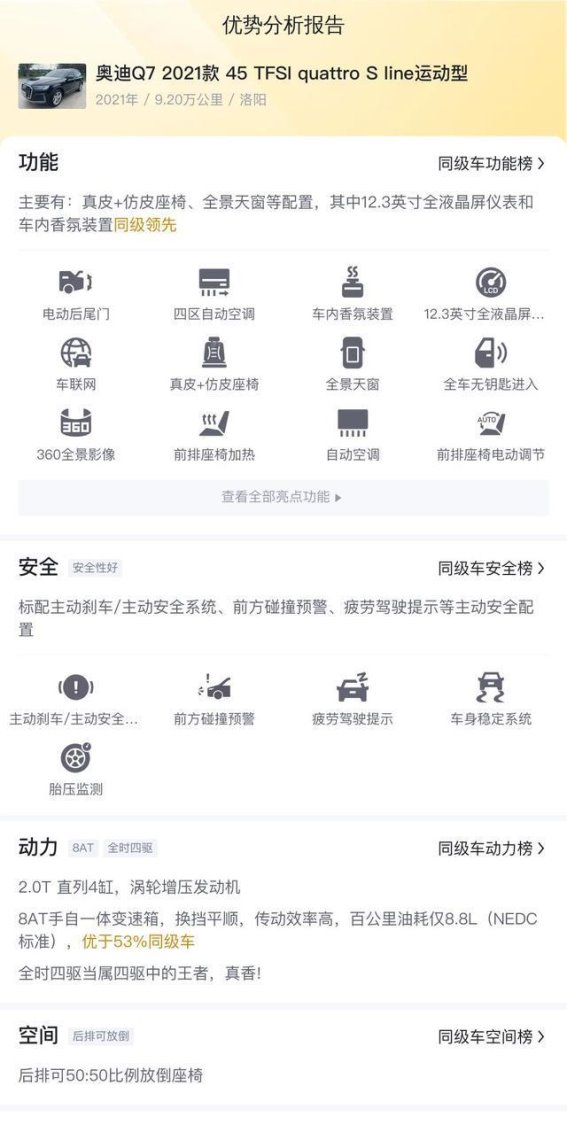 在优势与不足方面,这辆Q7的优势显而易见。座椅调节和舒适功能丰富,确保驾驶者及乘客在长途驾驶中保持舒适;车内空间宽敞,储物灵活;动力储备充足,满足日常驾驶和驾驶乐趣需求。缺点主要是车身尺寸较大,在狭窄路段行驶灵活性受限,同时油耗与动力输出相匹配偏高;曾有一次过户记录,也可能影响部分消费者的购车决策。总体来看,这些缺点并未显著影响其作为家庭用大型SUV的适用性和价值。