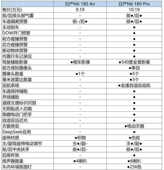 东风日产N6共提供五个配置版本,覆盖不同用户需求。入门版180Air售价9.19万元,配置较为基础,仅配倒车影像,缺少前后雷达和天窗,座椅为织物材质,也未配备完整的安全气囊和主动安全系统,因此对于追求安全和舒适性的家庭用户不太适合。相比之下,180Pro版本售价10.19万元,仅比入门版贵1万元,但增加了前后排头部气囊、360度全景影像、车侧盲区辅助、DOW开门预警和哨兵模式等安全配置,并搭载L2级全速自适应巡航系统,实现车道居中、并线辅助等功能,减轻驾驶负担。180Pro增加了无钥匙进入、隐藏电动门把手、电动天窗、DeepSeek大模型、皮质座椅、主驾电动调节、后排杯架、6扬声器音响及256色车内环境氛围灯等实用配置,兼顾安全、舒适与科技,是家庭用户性价比最高的选择。