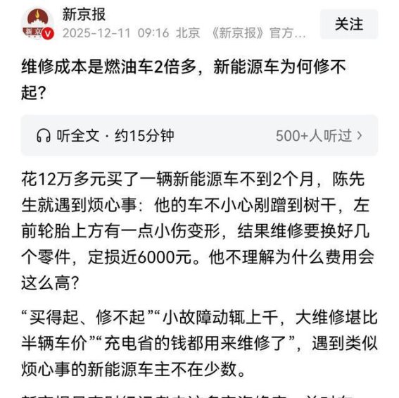 在新能源汽车的普及之际,车主们迎来了前所未有的“维修难”困境。陈先生购买的12万元新能源车,才行驶了两个月,左前轮胎上方出现了一个小剐蹭,结果维修费用却高达近6000元。这一价格远远超过了传统燃油车的维修成本,也让许多车主感到深深的无奈。根据专业数据显示,新能源车的维修费用是燃油车的2至2.5倍,涉及到核心部件时,费用甚至更加惊人。这种高昂的维修价格让许多车主产生了“修不起”的困扰,甚至出现了“不能修”的局面。新能源车的高维修成本是如何形成的?又该如何破局呢?