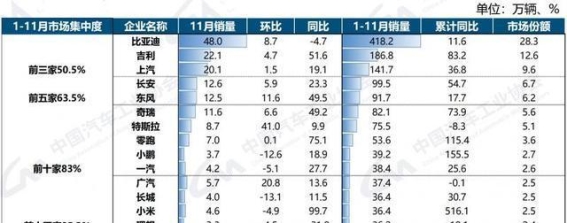 1-11月,新能源汽车销量排名前十五的企业集团合计销量达到1407.2万辆,占新能源汽车销售总量的95.2%,高于去年同期1个百分点。这些企业在技术研发和市场布局方面的优势,使得它们在行业竞争中占据了明显的主导地位。