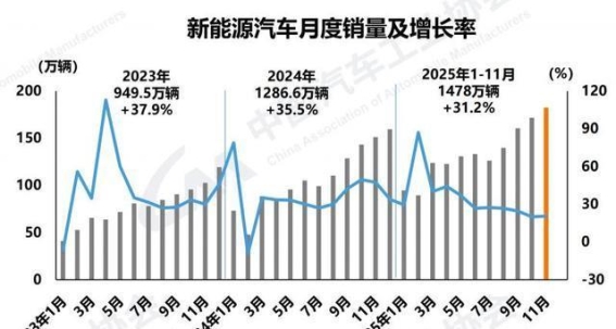 今年1-11月,新能源汽车的累计销量为1246.6万辆,同比增长23.2%。其中,新能源乘用车销量为1171.5万辆,同比增长21.3%;新能源商用车销量为75万辆,同比增长62.4%。这一系列数据表明,新能源汽车市场在乘用车和商用车两个领域的市场份额均在不断扩大,且增速稳定。