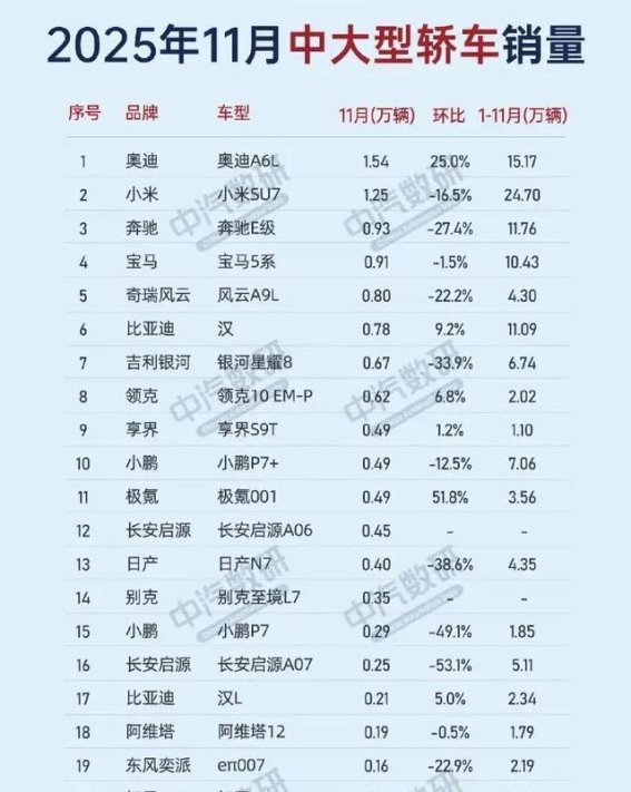 总体来看,11月份中大型轿车销量榜不仅是一组简单的数据,更揭示了市场格局的深刻变化。国产品牌凭借技术升级、设计优化和价格策略,占据了中大型轿车市场的主导地位。新车型如启源A06的快速走红,展示了市场对高性价比新能源轿车的强烈需求;阿维塔12等车型的稳步增长,也体现出国产品牌在品牌价值和产品深度上的探索成果。与此合资品牌若不能加快技术和产品迭代,其传统优势将面临进一步压缩。可以预见,中大型轿车市场竞争将更加激烈,而国产品牌逐步占据主导地位,可能已成为新常态。