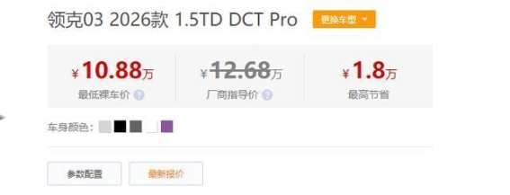 在10-15万元级运动轿跑市场,领克03近日释放出重磅优惠,以最高1.8万元的价格让利,瞬间吸引了大量年轻消费者的关注。裸车起售价仅为10.8万元,这意味着更多消费者可以以家用车预算轻松拥有一台颜值与性能兼具的运动座驾。此次优惠活动覆盖了2025款和2026款的主力车型,从入门版1.5TD DCT Plus到中配Pro版本均有不同程度的让利,性价比优势显著提升。无论是预算有限的年轻人,还是追求操控乐趣的车迷,都能在这一波优惠中找到适合自己的车型,市场关注度也随之升高,整个10-15万级运动轿跑市场因此呈现出新的活力。