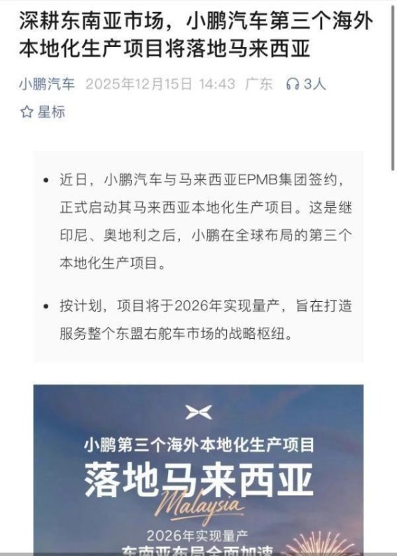 小鹏汽车在海外市场的布局节奏十分迅速,短短半年内,海外本地化生产项目已在印尼、奥地利和马来西亚陆续落地。今年7月,小鹏在印尼建成全球首个海外生产基地,随后9月在奥地利格拉茨麦格纳工厂启动欧洲本地化生产项目,并启用德国慕尼黑研发中心,为欧洲市场提供技术支撑。12月,小鹏第三个生产项目落地马来西亚,计划于2026年实现量产,服务整个东盟右舵车市场。小鹏相关人士表示,通过本地化生产,企业不仅能提供更符合当地消费者习惯的高品质智能产品,还能提升市场响应速度和品牌竞争力。今年前十个月,小鹏在马来西亚的纯电动车销量已跻身当地前六,显示出其在新兴海外市场的增长潜力和市场适应能力。
