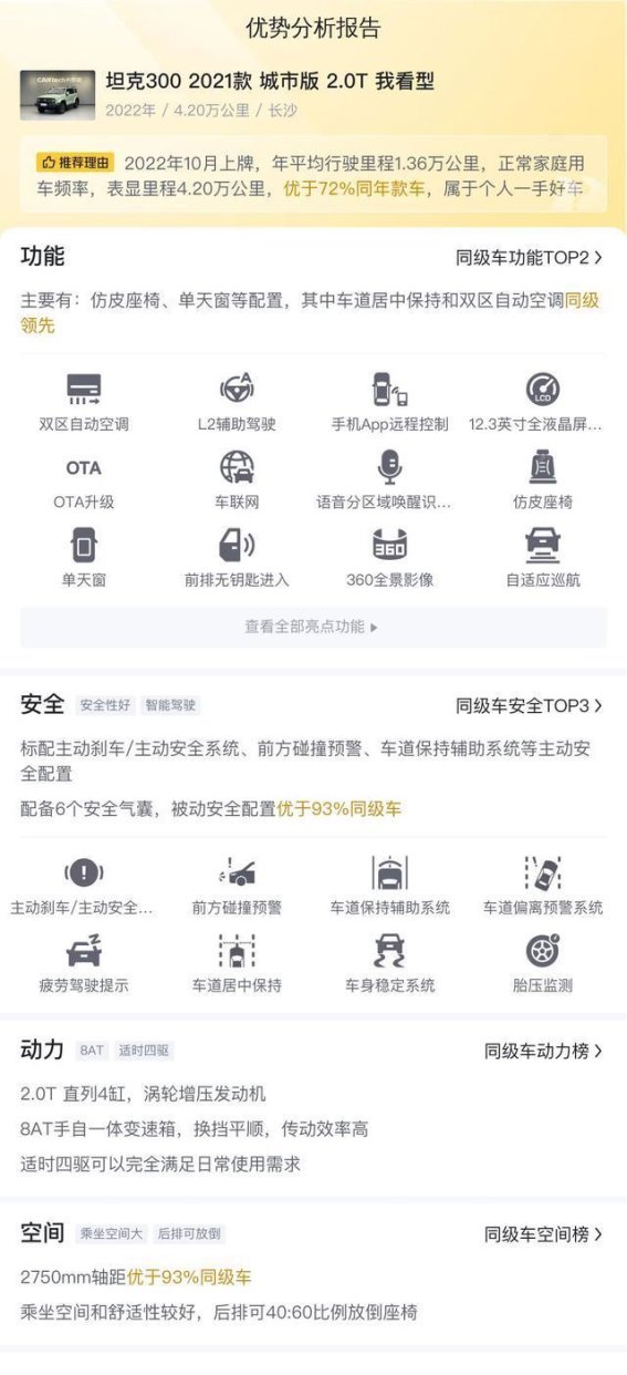 从优势来看,这辆坦克300车龄小、行驶里程少,并配备L2级别辅助驾驶系统,包括全速ACC自适应巡航、TJA交通拥堵辅助、ICA集成巡航辅助、BCA弯道运动控制、AEP自动紧急转向辅助等功能,能够显著减轻驾驶疲劳,让日常用车更加轻松安全。缺点方面主要体现在用车成本上,由于2.0T发动机油耗相对偏高,但对于二手车买家而言,这一点影响相对有限,可根据个人驾驶习惯权衡。
