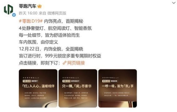 12月19日,零跑汽车旗下全新旗舰车型零跑D19的内饰设计首次曝光,引起了业内与消费者的广泛关注。作为零跑D平台打造的首款车型,零跑D19自10月16日首发亮相以来,就一直备受瞩目。11月1日,零跑D19开启了盲订模式,用户可支付999元意向金确认预订,并享有优先排产和加速交付的权益。官方表示,新车的内饰设计将在12月22日正式发布,而上市时间预计在2026年上半年,售价或在30万元左右。此次内饰曝光不仅展示了零跑D19的豪华质感,也体现了零跑汽车在旗舰SUV市场的布局与设计理念。