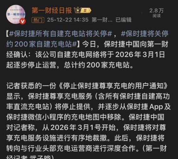 导读: 近日,保时捷宣布将于2026年3月1日起,逐步关停其自建充电网络,总计约200家充电站。这一消息一经发布,便引发了业界和消费者的高度关注