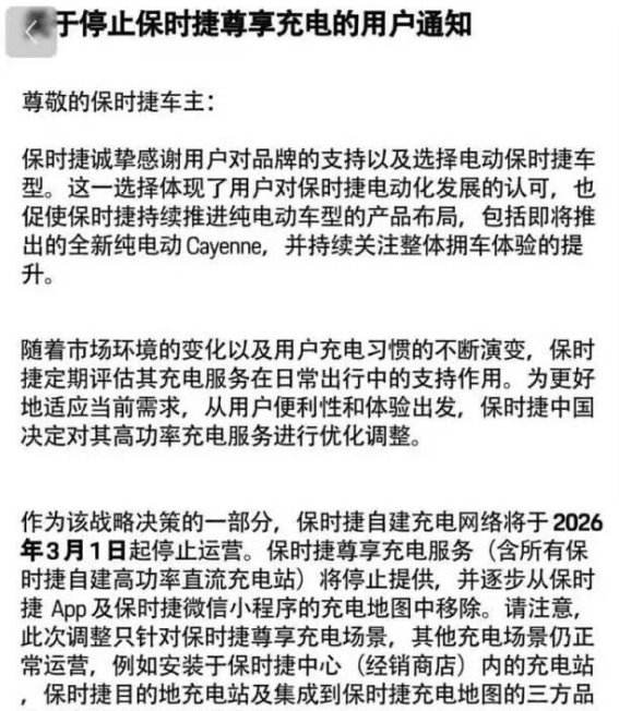 近日,保时捷宣布将于2026年3月1日起,逐步关停其自建充电网络,总计约200家充电站。这一消息一经发布,便引发了业界和消费者的高度关注。据保时捷官方用户通知显示,此次调整主要涉及保时捷尊享充电服务,包括所有自建高功率直流充电站,并将在保时捷App及微信小程序的充电地图中逐步移除。值得注意的是,这一调整仅针对自建高功率充电场景,而安装在保时捷中心的充电设施、目的地充电站以及集成至保时捷充电地图的第三方品牌充电站仍将正常运营。这意味着,保时捷在优化高功率充电服务的仍然保障用户日常出行的便利性和体验。