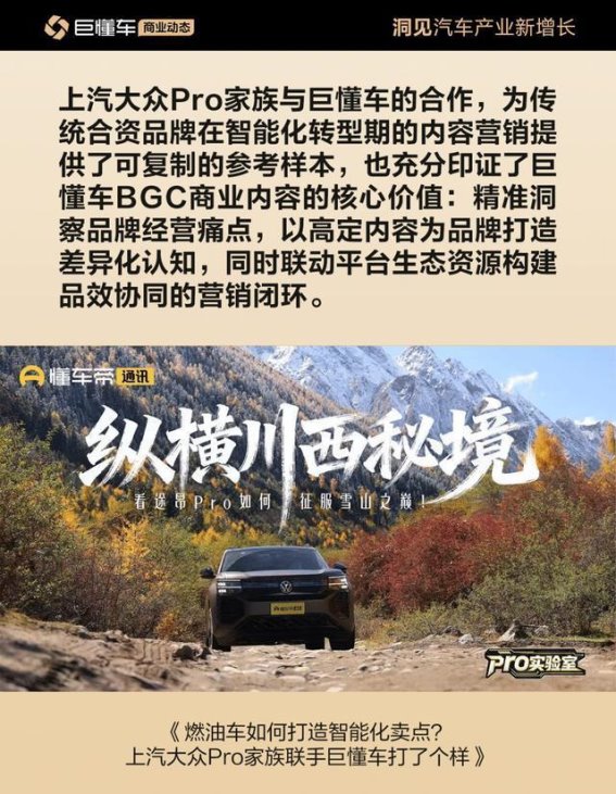 上汽大众Pro家族与巨懂车的合作,为燃油车智能化转型提供了可复制的实践样本。通过定制化BGC栏目搭建产品力“证言场”,将技术卖点转化为用户可感知的生活价值,再以达人矩阵实现心智全域渗透,辅以跨端追投完成从种草到用户转化的闭环经营。这一实践充分证明,通过精准洞察品牌痛点、打造差异化、联动平台生态资源构建品效协同闭环,燃油车同样能够突破智能化认知瓶颈,巩固市场竞争力,实现品牌价值的全面提升。