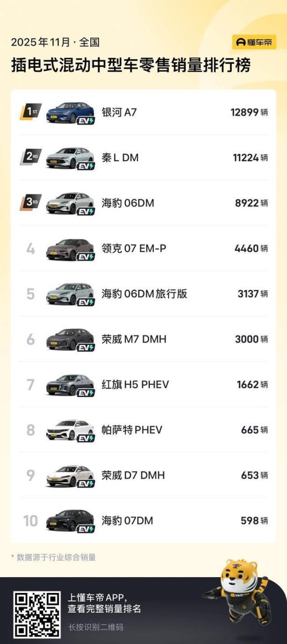 导读: 在2025年11月的全国插电式混动中型车零售销量榜单上,吉利银河A7以12899辆的成绩稳居榜首,连续四个月销量突破万辆大关,凭借稳定的